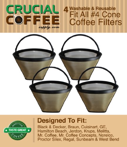 You still want to buy the 4 Washable & Reusable Coffee Filters # 4 Cone Fit Black & Decker, Braun, Cuisinart, GE, Hamilton Beach, Jerdon, Krups, Melitta, Mr. Coffee, Mr. Coffee Concepts, Norelco, Proctor Silex, Regal, Sunbeam & West Bend; Designed & Engineered by Crucial Coffee?. The4 Washable & Reusable Coffee Filters # 4 Cone Fit Black & Decker, Braun, Cuisinart, GE, Hamilton Beach, Jerdon, Krups, Melitta, Mr. Coffee, Mr. Coffee Concepts, Norelco, Proctor Silex, Regal, Sunbeam & West Bend; Designed & Engineered by Crucial Coffee is basically a very good product. If compared to the others. 4 Washable & Reusable Coffee Filters # 4 Cone Fit Black & Decker, Braun, Cuisinart, GE, Hamilton Beach, Jerdon, Krups, Melitta, Mr. Coffee, Mr. Coffee Concepts, Norelco, Proctor Silex, Regal, Sunbeam & West Bend; Designed & Engineered by Crucial Coffee is clearly better.Buy now !!, you might have a price save, you should check the price before you buy.Of course, everybody wants to have their been then you should check-sized price is at the bottom.