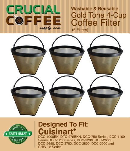 6 4-Cup Crucial Coffee Gold Tone Filter fits models DCC-1000BK, DTC-975BKN, DCC-750 Series, DCC-1100 Series DCC-1200 Series, DCC-2200, DCC-2600, DCC-2650, DCC-2750, DCC-2800, DCC-2900 and CHW-12 series coffee makers by Cuisinart. Easy to clean: Rinse under running water or clean in the dishwasher after emptying grounds. Easy to use: Simply place in the filter holder and fill with ground coffee. Promotes full-flavored coffee. Helps eliminate the need for paper filters.