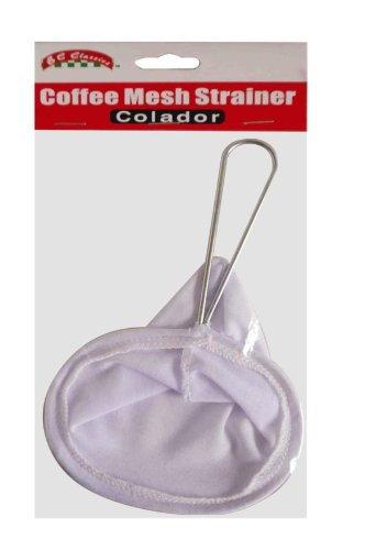 White mesh cotton strainer with sturdy metal handle. Strains coffee to provide a smooth rich strong cup of coffee with out gritty grounds. Can also be used for tea. Reusable making a green option to paper filters.