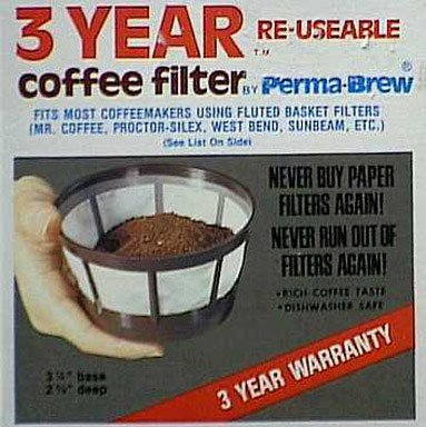COFFEE FILTER BASKET - Reusable. Replaces paper filters. Polyester mesh with polypropylene frame. Fits most coffeemakers using fluted basket filters. Does not fit Jr. or mini models. 3 year replacement warranty.
