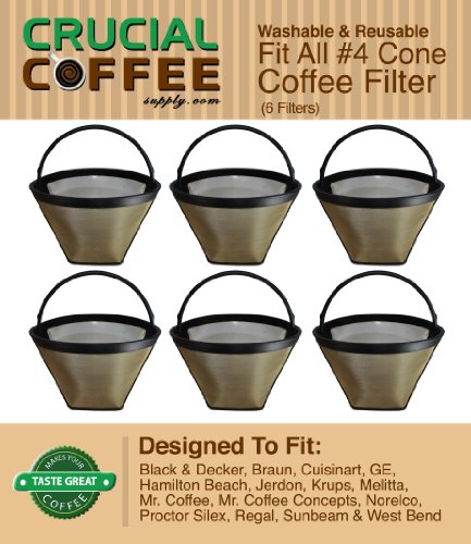 You still want to buy the 6 Washable & Reusable Coffee Filters # 4 Cone Fit Black & Decker, Braun, Cuisinart, GE, Hamilton Beach, Jerdon, Krups, Melitta, Mr. Coffee, Mr. Coffee Concepts, Norelco, Proctor Silex, Regal, Sunbeam & West Bend; Designed & Engineered by Crucial Coffee?. The6 Washable & Reusable Coffee Filters # 4 Cone Fit Black & Decker, Braun, Cuisinart, GE, Hamilton Beach, Jerdon, Krups, Melitta, Mr. Coffee, Mr. Coffee Concepts, Norelco, Proctor Silex, Regal, Sunbeam & West Bend; Designed & Engineered by Crucial Coffee is basically a very good product. If compared to the others. 6 Washable & Reusable Coffee Filters # 4 Cone Fit Black & Decker, Braun, Cuisinart, GE, Hamilton Beach, Jerdon, Krups, Melitta, Mr. Coffee, Mr. Coffee Concepts, Norelco, Proctor Silex, Regal, Sunbeam & West Bend; Designed & Engineered by Crucial Coffee is clearly better.Buy now !!, you might have a price save, you should check the price before you buy.Of course, everybody wants to have their been then you should check-sized price is at the bottom.